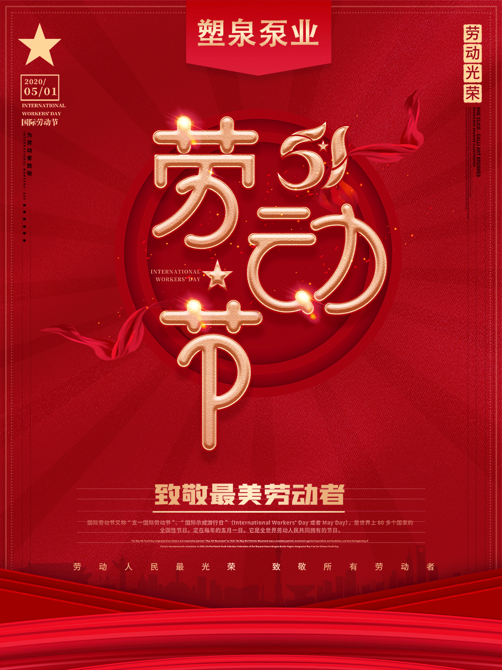 一年一度的五一小長假將至,在這里上海塑泉泵閥科技有限公司全體員工向您及您的家人送出最真摯的祝福,提前祝大家勞動節(jié)快樂!